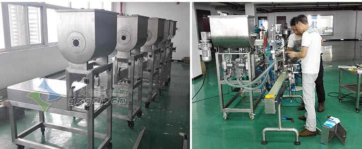 3、該灌裝生產線配置兩個灌裝頭,同步工作,效率高,醬料可均勻地被擠壓灌裝到容器里。