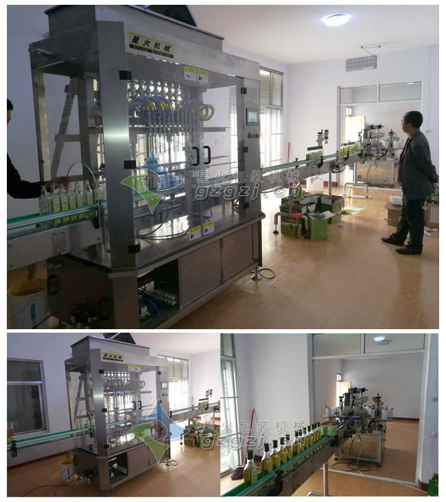 核桃油灌裝生產線客戶車間,該灌裝生產線由12頭液體灌裝機-壓蓋機-貼標機、噴碼機等設備組成;此外也可用于瓶裝的如山茶油、色拉油、花椒油、橄欖油等灌裝