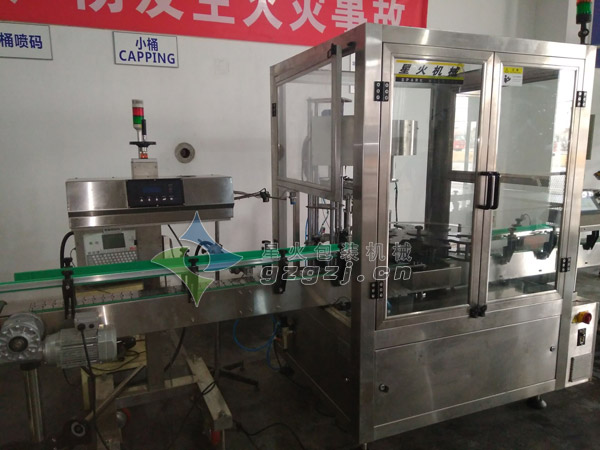灌裝完成后,自動進入旋蓋噴碼環(huán)節(jié),由旋蓋機旋蓋之后,交由噴碼機進行工作